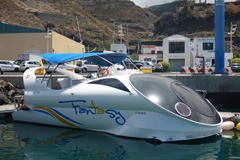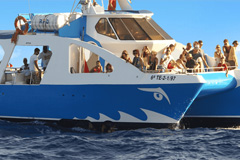 Nos dirigimos al puerto de Tazacorte desde donde comenzará nuestra aventura marítima. Nos integramos en un grupo que saldrá al mediodía a bordo del Fancy II. El catamarán es muy cómodo, con posibilidad de estar a la sombra o en la parte superior para verlo todo. También tiene en la parte inferior unas ventanas de visión submarina. Y con toda la seguridad, chalecos, zodiac. Para los miedosos.