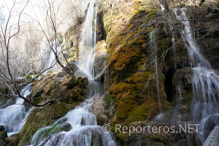 El camino avanza entre pinares, musgos y pequeñas corrientes de agua que anuncian la proximidad de las cascadas, un verdadero espectáculo natural. Allí el agua se descuelga por una serie de cascadas escalonadas que se deslizan sobre formaciones de roca caliza cubiertas de musgo, creando uno de los paisajes más fotogénicos de toda la provincia. Si tenemos la suerte de que las lluvias han sido abundantes, como es el caso, el caudal se multiplica y el sonido del agua lo envuelve todo.